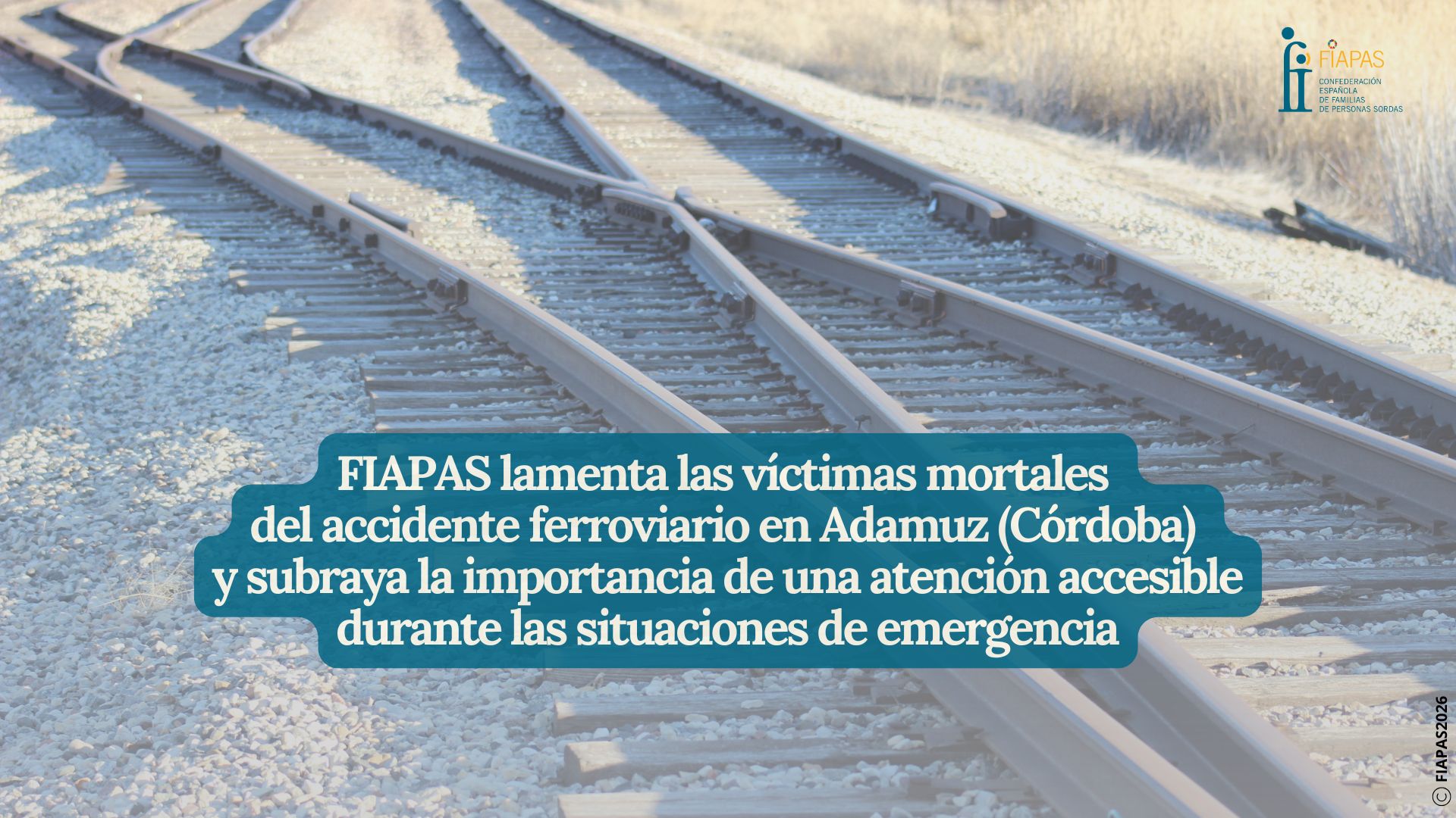 Desde la Confederación Española de Familias de Personas Sordas (FIAPAS) expresamos nuestro más sentido pésame por los trágicos fallecimientos ocurridos como consecuencia del grave accidente ferroviario ocurrido anoche en el término municipal de Adamuz (Córdoba).