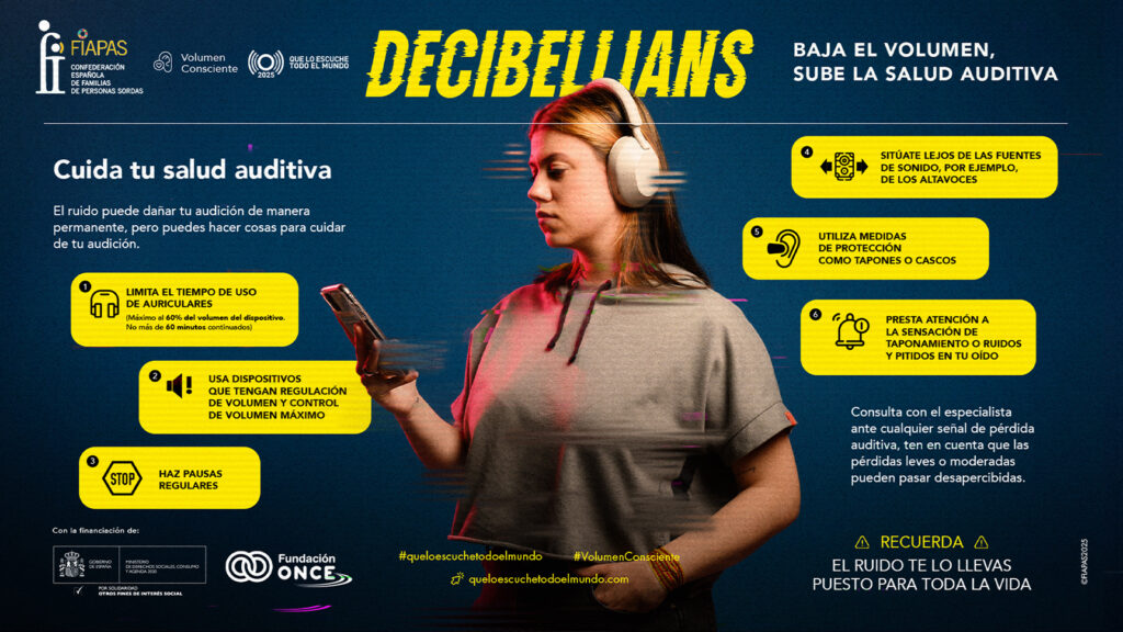 La pérdida auditiva no es solo cosa de mayores, puede aparecer a cualquier edad y muchas veces pasa desapercibida en sus fases iniciales. El daño producido por el ruido es irreversible y sus efectos son acumulativos. Por ello, FIAPAS insiste en la necesidad de concienciar sobre el impacto del ruido y la importancia de adoptar hábitos de escucha saludables.